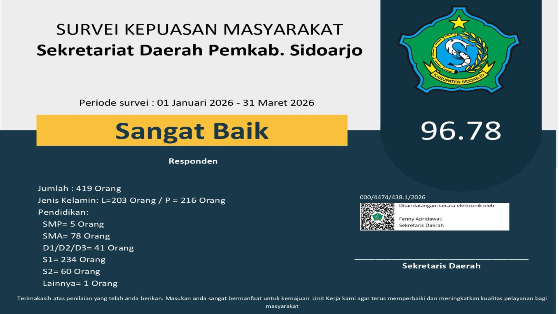 Sekretariat Daerah Kabupaten Sidoarjo bertugas membantu Bupati dalam melaksanakan tugas penyelenggaraan pemerintahan, administrasi, organisasi dan tata laksana serta memberikan pelayanan administrasi kepada seluruh Perangkat Daerah Kabupaten Sidoarjo.